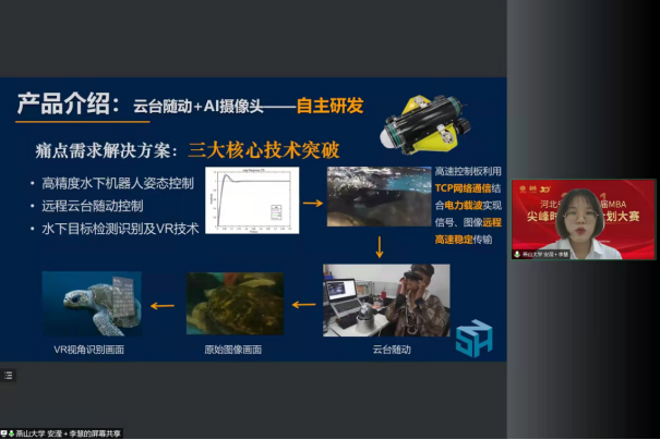 燕山智控团队的《智慧云平台控制系统——面向流程工业的智能协同优化》、海智科技团队的《鹦鹉螺——沉浸式水下探索》项目晋级到决赛线上展示环节。在比赛中,各校参赛代表对各自的企划项目进行全方位展示,并通过项目介绍、答辩等环节进行比赛。虽然比赛搬到了线上,但各参赛代表们以充分的准备、饱满的激情和十足的自信赢得了评审专家们的好评。