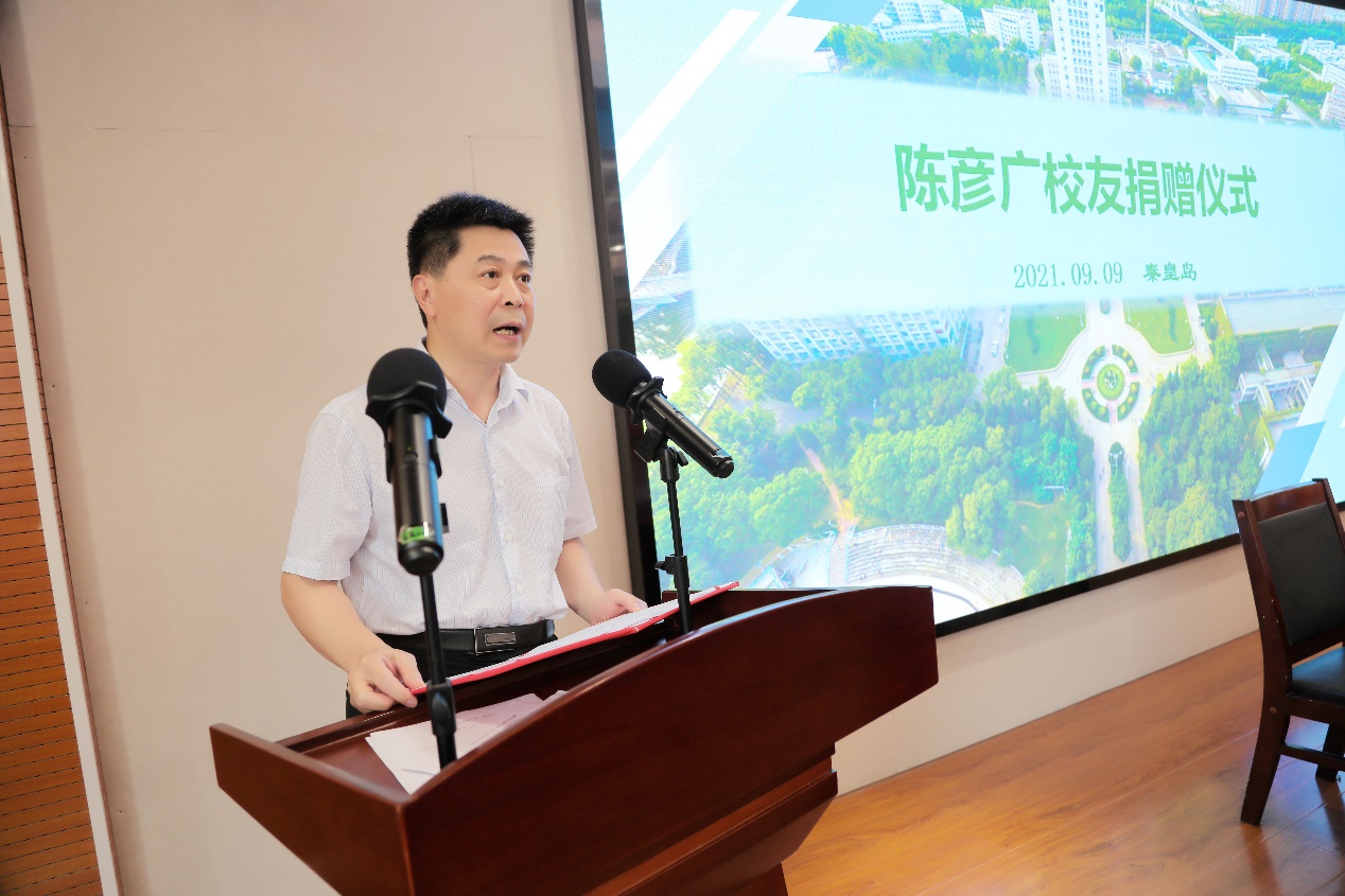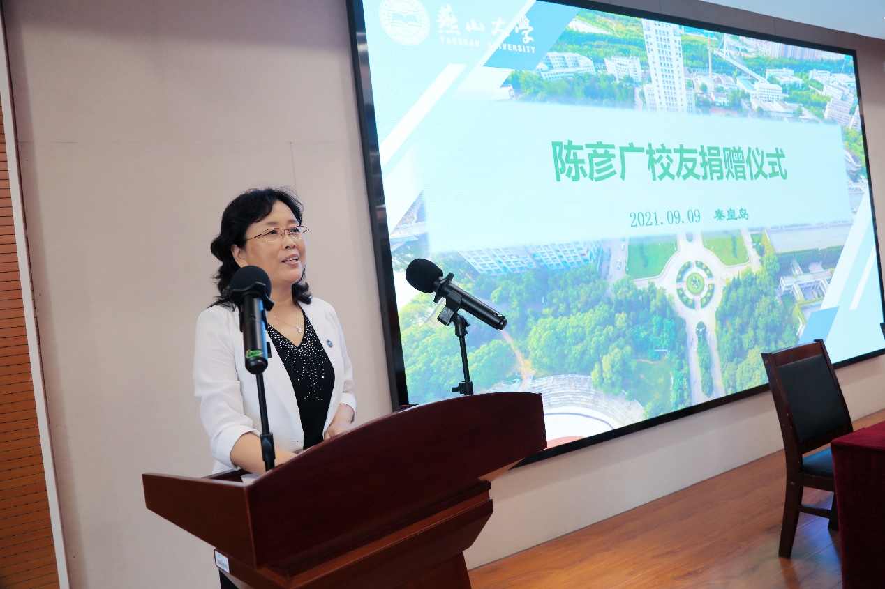 的渊源,以及陈彦广校友萌生捐赠想法的初衷,对陈彦广校友的爱院情节表示赞许与衷心的感谢。她表示,陈彦广校友多年来一直关注学院发展,在人才培养、专业建设等多方面为学院助力。校友是学院最为宝贵的资源和财富,希望校友们继续和学院保持密切联系,在全面参与母校人才培养、科技服务、文化传承中打造校友文化品牌。
