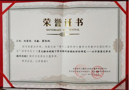 电子商务系王旭老师受邀做题为《多元融合视域下学术期刊话语权评价研究》的论文报告,得到参会同仁的认可和好评。该文荣获会议优秀论文三等奖,已被情报学领域顶级期刊《情报学报》录用。该期刊是国家自然科学基金管理学部A类期刊、入选FMS管理科学高质量期刊推荐列表(T1)、CSSCI来源期刊、北大核心期刊、人大复印报刊资料重要转载来源期刊和RCCSE A+权威期刊。