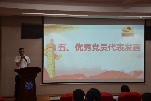 优秀学生党员代表陆川同志回顾了自己的入党经历,表示作为青年党员,将进一步树立对马克思主义的信仰、对中国特色社会主义的信念和对中华民族伟大复兴中国梦的信心,将到人民群众中去、到新时代广阔天地中去,让理想信念在创业奋斗中升华,让青春在创新创造中闪光。