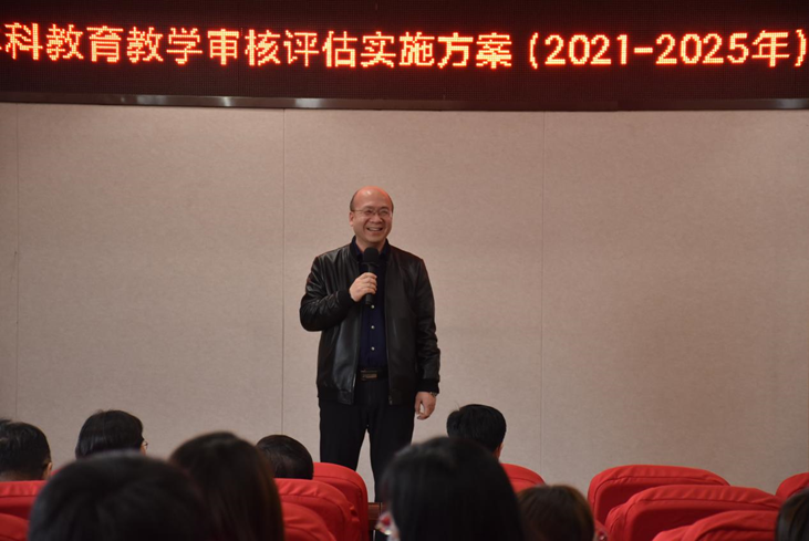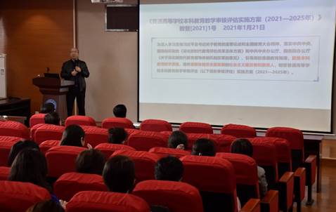 靖鲲鹏首先介绍了审核评估实施方案的指导思想、基本原则、评估程序、周期及分类。根据学院办学定位及工作现状,重点讲解了第二类审核评估体系,指出要重点关注学院本科人才培养目标定位、专业特色凝练、培养过程及教学成效,鼓励教师加大对本科生及已毕业学生发展的关注,将相关指标体现在培养方案修订和人才培养全过程中。