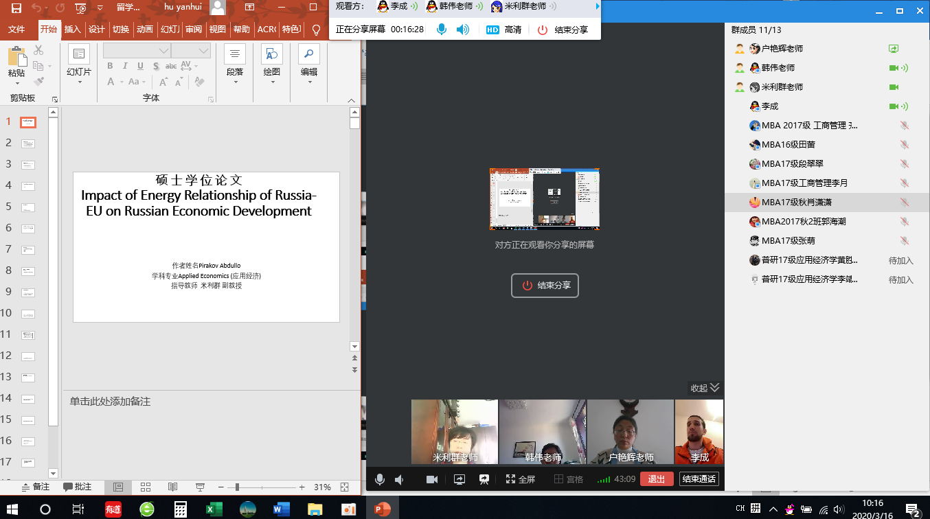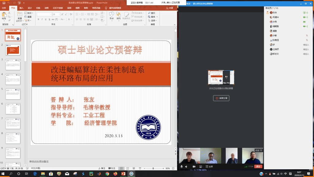 3月份以来,学院组织研究生指导教师以导师或导师组为单位,通过QQ群、微信群、在线会议、在线课堂等网络形式开展预答辩,检查论文进度和质量,做好指导工作,并提供网络截图备案,做到导师负责,在线指导,方式灵活,经验分享。截至3月16日,60余位研究生指导教师组织参与完成了230余名研究生的线上预答辩,涵盖了博士生、全日制研究生、在职研究生、MBA、留学研究生等各类型毕业生。