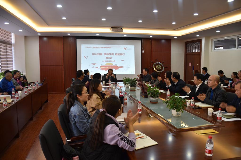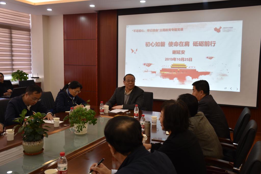 “不忘初心、牢记使命”主题教育实施方案》安排,10月25日14时30分,校党委副书记,校“不忘初心、牢记使命”主题教育领导小组副组长、办公室主任谢延安在经管楼A216会议室以“初心如磐,使命在肩,砥砺前行”为主题,为统战部、工会、安全工作处、成人网