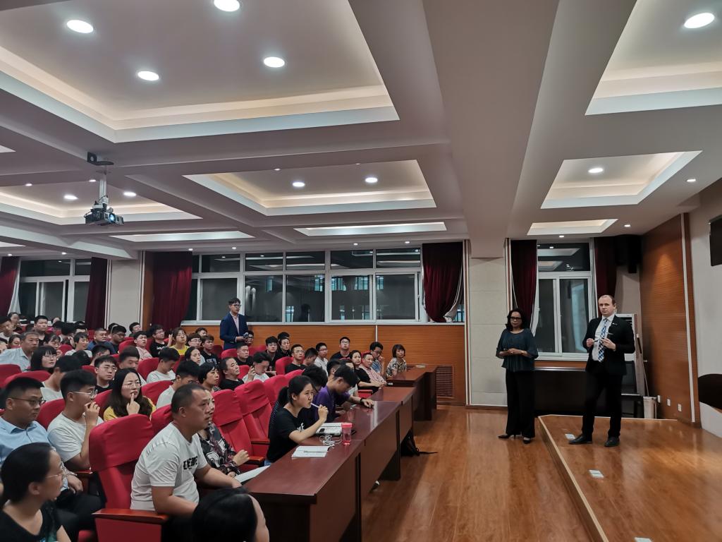 科廷大学科学工程学院院长Chris Rawson和国际事务助理Saba Amanuel介绍了科廷大学办学历史、学校QS排名、学术地位、合作学院科学与工程学院的排名、合作专业数理与统计学系的师资力量、科廷大学的学生活动、生活、交通及珀斯市的相关情况。在互动环节,同学们就科廷大学的住宿、学费、攻读学位及安全等各个方面与外方教师进行深入交流。2019级新生的自信表达、勇于提问、踊跃发言、发音标准、语言流畅,让人眼前一亮,学生的整体素质和质量有明显提高。