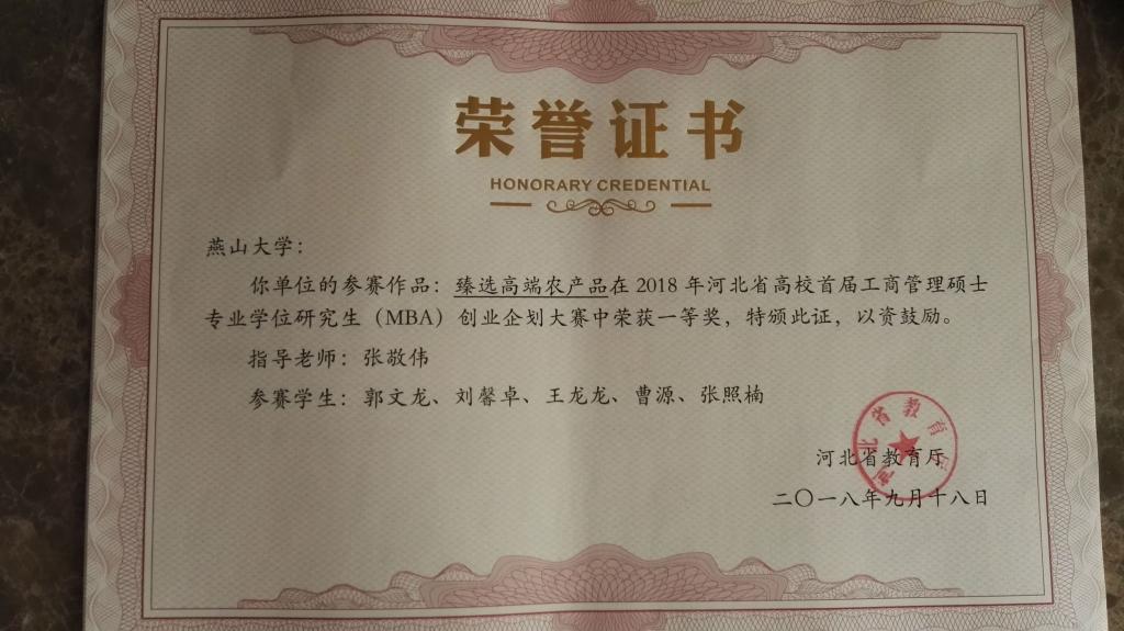 2017级MBA学员郭文龙等5人的参赛作品《臻选高端农产品》荣获河北省赛区的一等奖,最终脱颖而出,并成功晋级决赛。