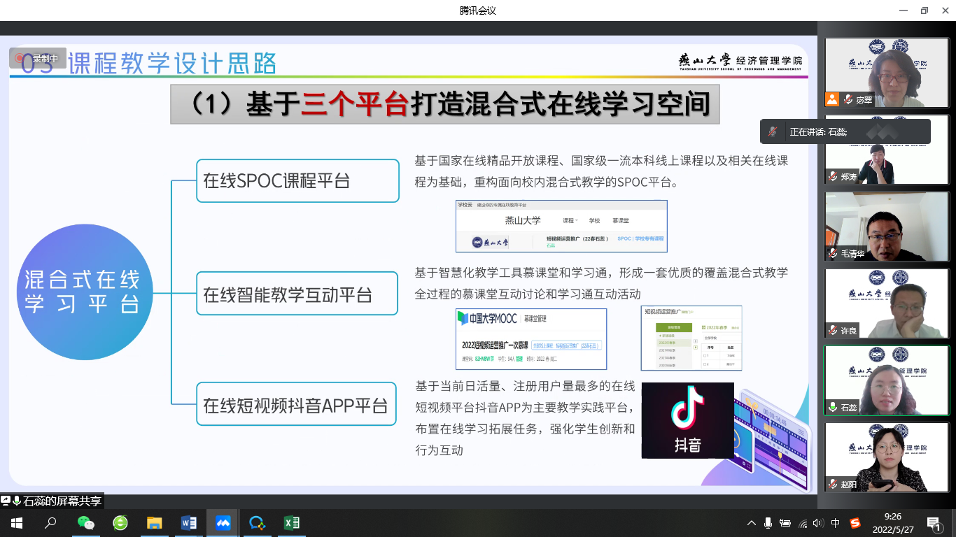 组织进行了混合式教学创新设计大赛院赛暨混合式教学交流会于5月27日,腾讯会议线上召开。此次比赛由院长李春玲教授担任组长,周荣辅、毛清华、郑涛、宓翠四位老师组成评审小组。来自工商、会计、工业工程和经济系的四名选手对开展混合式教学的课程进行了展示和分享。
