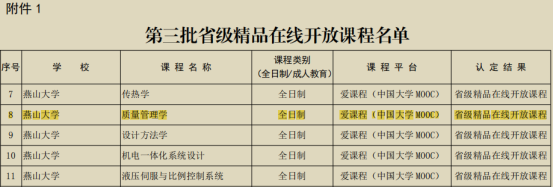 根据《河北省教育厅关于公布第三批省级立项精品在线开放课程验收认定结果的通知》(冀教高函[2022]36号),成人网 5门课程验收合格。成人网 的《质量管理学》(负责人:赵玉忠)通过验收,认定为省级精品在线开放课程。这是近年来成人网 获得的第一个省级精品在线开放课程。
