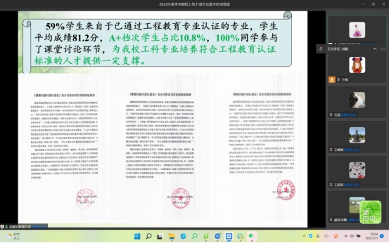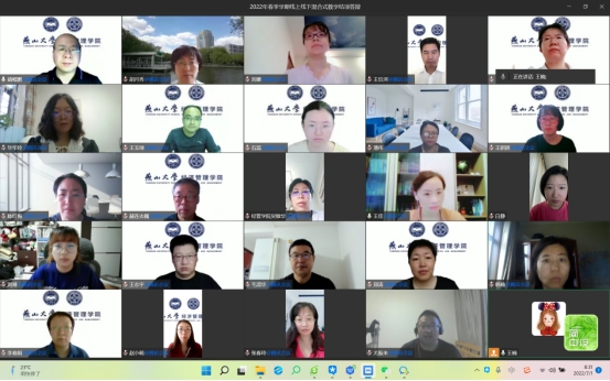 于7月1日以腾讯会议形式组织了2022年春季学期线上线下混合式教学课程验收汇报会。此次汇报会由靖鲲鹏教授担任组长,赫连志巍、王玖河、毛清华、郑涛四位老师组成评审小组,来自6个系的26位老师对混合式教学课程进行了展示和汇报。