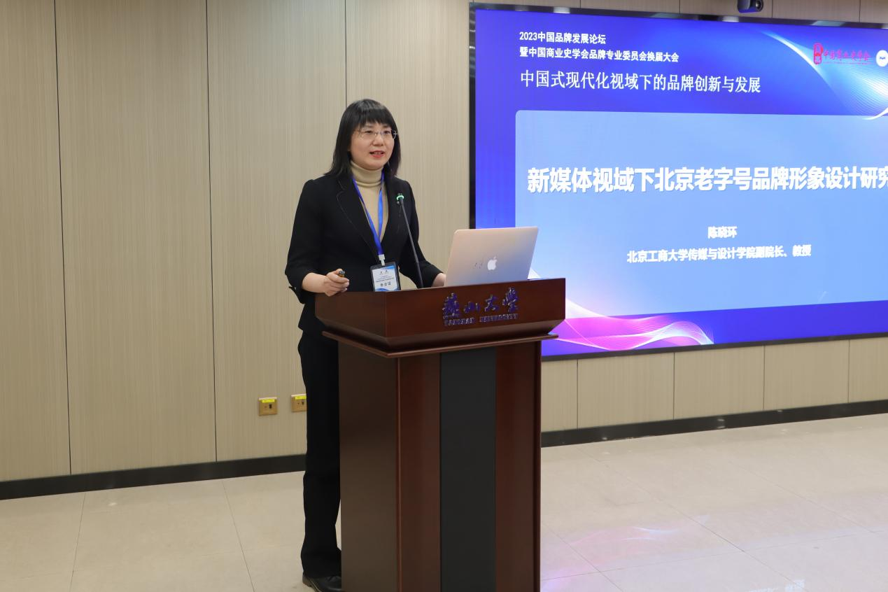 陈晓环教授作了题为《新媒体视域下北京老字号品牌形象设计研究》的报告,该报告从北京老字号品牌形象设计概述、新媒体与北京老字号品牌形象、北京老字号品牌形象设计现状、北京老字号品牌形象的定量研究等部分,详细介绍了新媒体环境下为北京老字号品牌高质量发展的策略与方法。