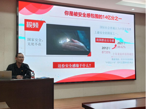 活动初始,李老师通过一个国家安全相关视频让同学们深切感受到了国家安全无处不在,并通过数据说明了在此背景下我国群众安全感十年来始终保持高位并持续上升,接着李老师从三个方面为同学们展开培训讲解。
