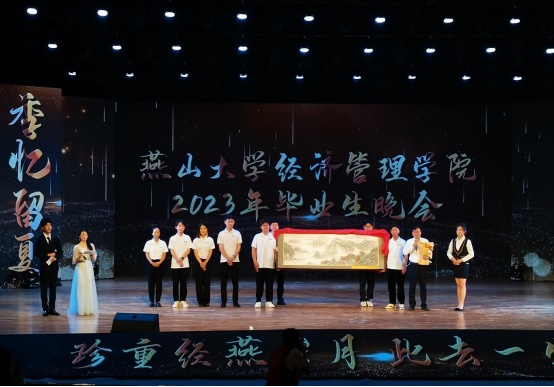 晚会中篇,专业老师代表为同学们送上临别赠言和精心准备的礼物。陈晶璞副院长送上书籍《乡土中国》,经济系郑涛老师送上存钱罐,工商管理系王玖河老师送上笔记本,旅游系付岗老师送上地球仪,工业工程系许良老师送上安全帽,会计系臧秀清老师送上算盘,电子商务系胡心专老师送上无线鼠标,寄语毕业生牢记专业培养,未来前程似锦。