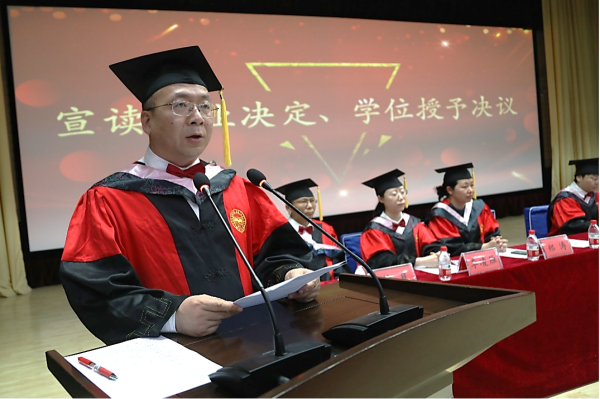 典礼在庄严的国歌奏唱声中开幕。靖鲲鹏宣读本科生毕业决定和本科生学位授予决议;陈晶璞宣读推荐授予宋禹霏等3名2023届毕业生荣誉学士学位文件;张振华宣读省、校级优秀毕业生表彰文件。