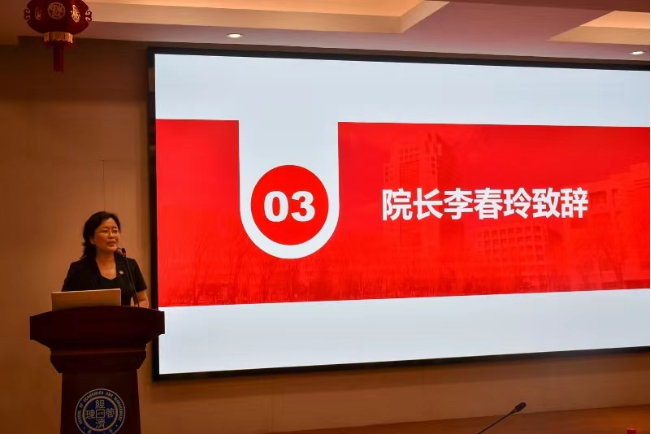 院长李春玲代表学院致辞,她介绍了学院及MBA教育中心的发展历史、使命愿景、课程设置、人才培养、办学成果等方面的情况,希望广大新生树立远大理想、牢记使命担当,发扬成人网