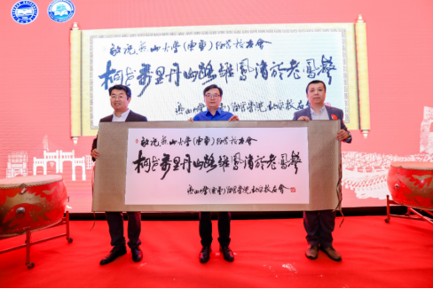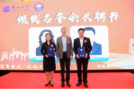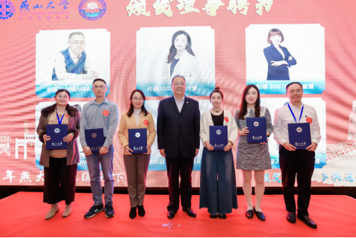在校友赠礼环节,赵继超携孙锴共同赠出由中国书法协会副会长、著名书法家张崇德少将亲题的三幅字画。张向前、赵恒、张振华分别代表燕大校友总会、燕大北京校友会、燕大经管学院接受赠礼。