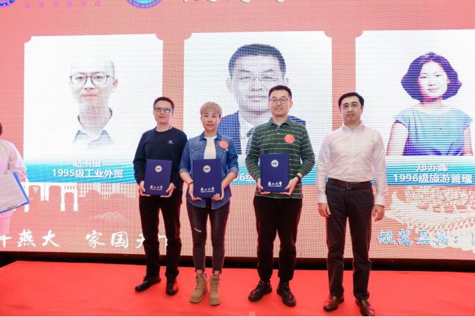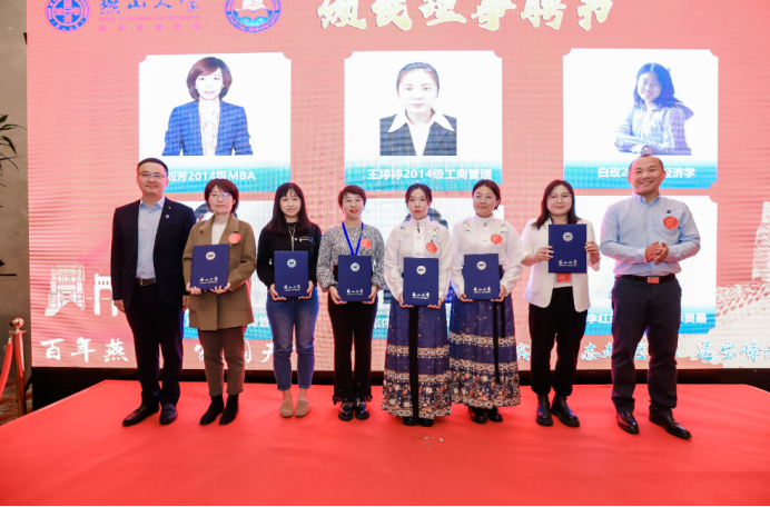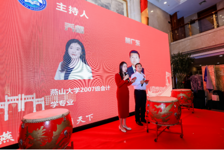 2003级会计专业校友姜棋,2007级旅游专业校友赵娜,2009级会计专业校友薛广东,2013级工商专业校友王明月,2014级工商专业校友王婷婷五名校友演出的诗朗诵《家国天下,再续辉煌》节目,再次点燃会场。一声声掷地有声的吟诵,饱含对母校及学院的真挚情谊,表达每位燕大经管人心中至真至深的家国情怀。