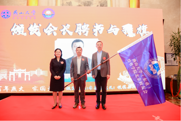 随后,举行受聘及授旗仪式,校、院领导分别为经管学院北京校友会名誉会长、会长、副会长、理事以及资深校友颁发聘书。