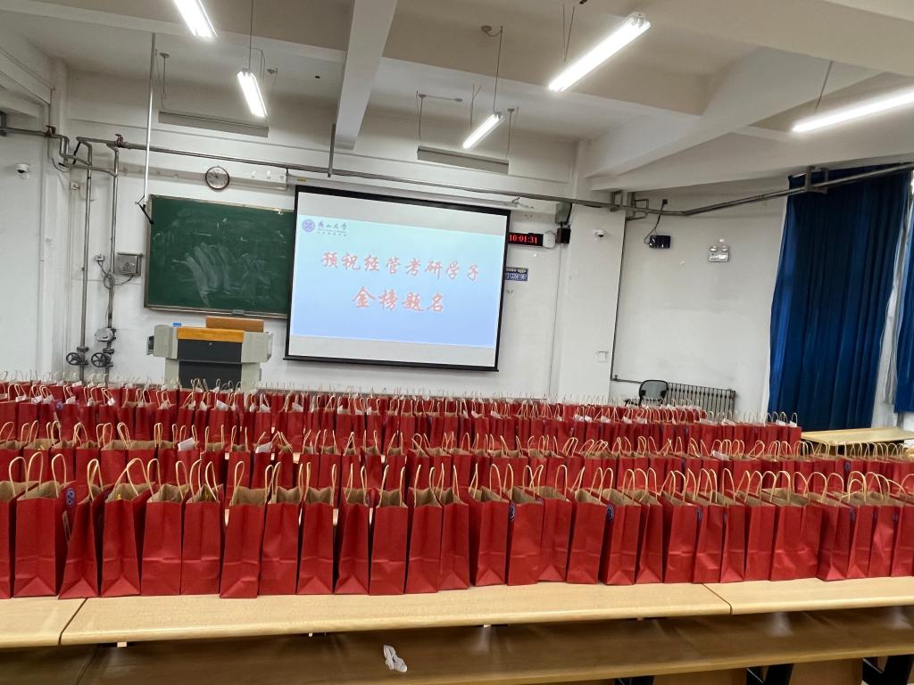向考研学子赠送加油礼包是经管学院的一项传统,已经连续开展多年。今年,近400位正在备战考研的学子收到了这份加油礼包,希望同学们从这一份份精心准备的礼物中,感受到学院的殷切期望和诚挚祝福,愿你终成所愿,愿你一往无前,愿你在这个冬日一战成硕!