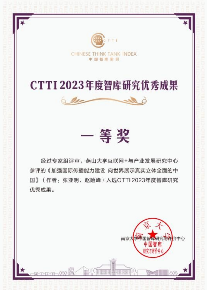 互联网+与产业发展研究中心、省重点联系智库河北数字经济与康旅文化产业研究院共同申报的成果为发表在《人民日报》(理论版)文章《加强国际传播能力建设,向世界展示真实立体全面的中国》( 2022年03月01日09版),该文章在CTTI2023年度“智库研究优秀成果”一等奖评选斩获佳绩。这是自去年“2022新型智库治理论坛”研究中心申报的专著成果《非传统安全事件网络群体集聚舆情传播与治理研究》获得河北省优秀社科成果一等奖和CTTI特等奖后又一佳绩!