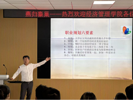 94级校友孙锴回忆了自己在燕大的时光,以过来人的角度,建议同学们积极参与社团活动,培养团队合作能力和责任感,这对未来工作的人际交往将大有裨益。在最好的年纪,保持激情,有一个积极向上的态度。他进一步从血缘、姻缘、学缘、地缘、事缘、趣缘六个方面分享了职业规划的要素,告诫同学们对所处的环境不要抱怨和懈怠,要努力改变自己,为母校的发展贡献力量。