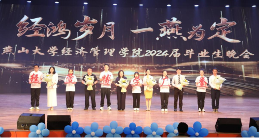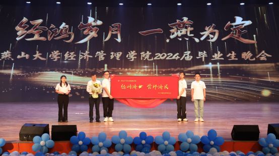 中场环节,学院各系教师代表为毕业生们赠送一个富有寓意的“字”,连贯起来组成“经管博学广誉”,这些字不仅是各专业特色的浓缩,更是对经管学子全面发展的殷切期望。同时,毕业生们也将一份特别的礼物敬献给学院,牌匾上“经国济世,管邦济民”八个苍劲有力的大字,寓意着学子们愿以所学为国为民,贡献力量,这不仅是对学院教育理念的肯定,更是学子们对未来担当与责任的承诺。