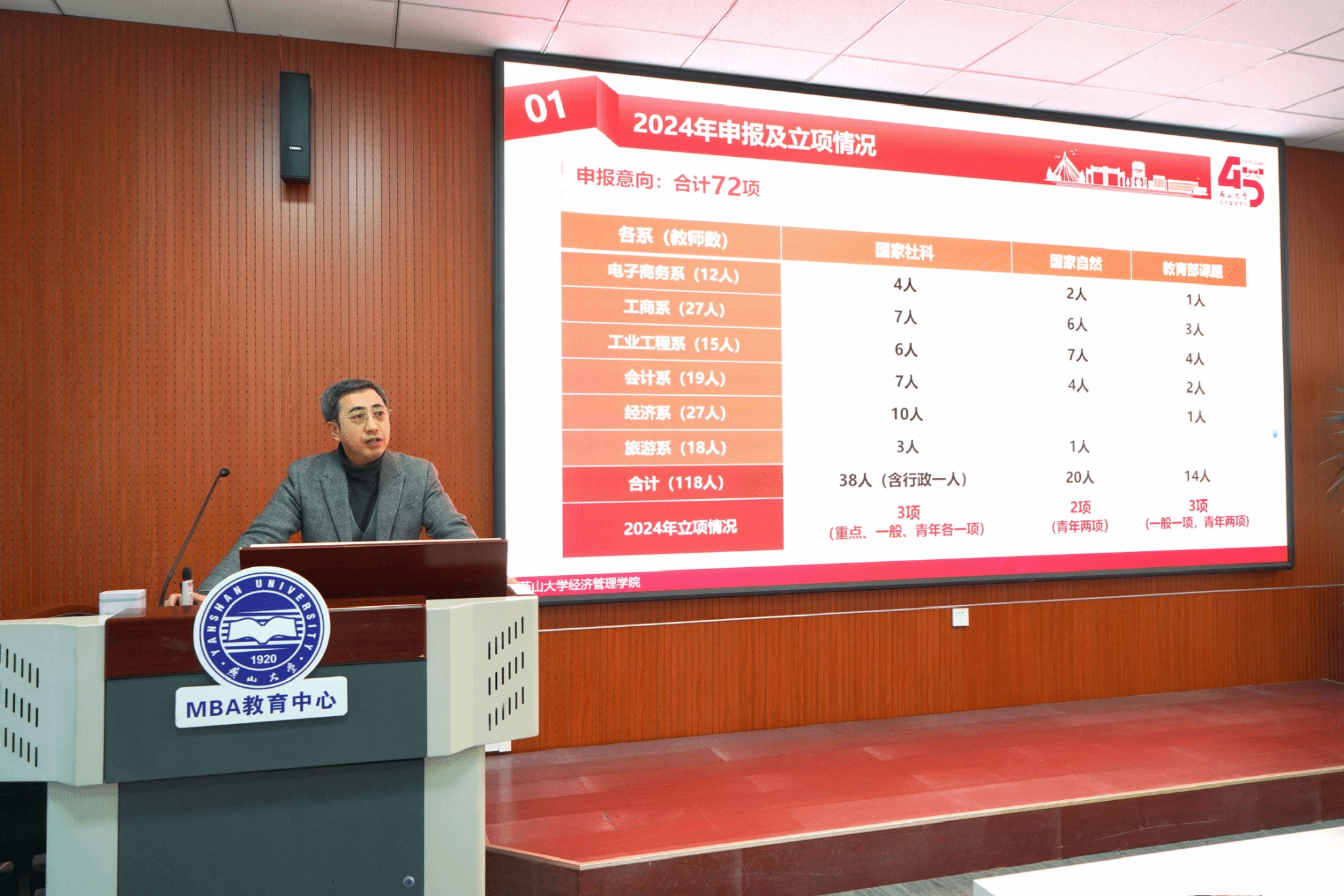 陈晶璞副院长总结了2024年度国家基金申报工作,对2025年度工作进行了部署。他回顾了过去一年学院在国家基金申报方面所取得的成就与不足,深入分析了当前基金申报的形势与挑战。他强调,国家基金申报不仅是教师个人科研能力的重要体现,也是学院整体科研实力的重要标志;鼓励全体教师要以更加饱满的热情和更加严谨的态度投入到2025年的基金申报工作中去。