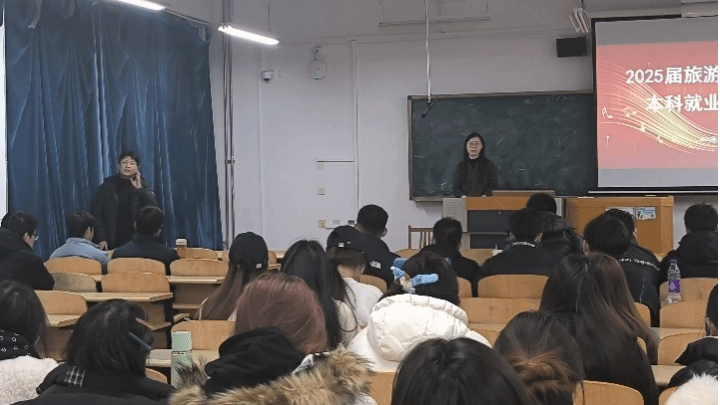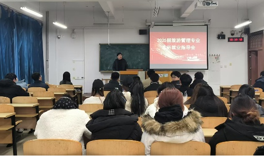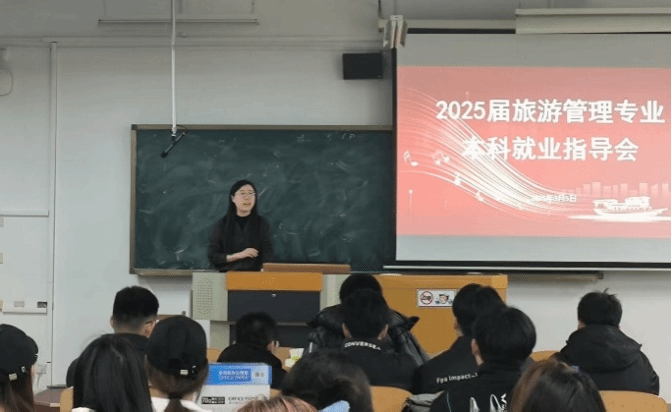 旅游系开展了2025届旅游管理专业本科就业指导会。会议由旅游系副主任高磊主持,旅游系党支部书记李凌雁参加会议,本次大会旨在为大四学生提供全面的职业规划指导,同时强调毕业相关事宜。