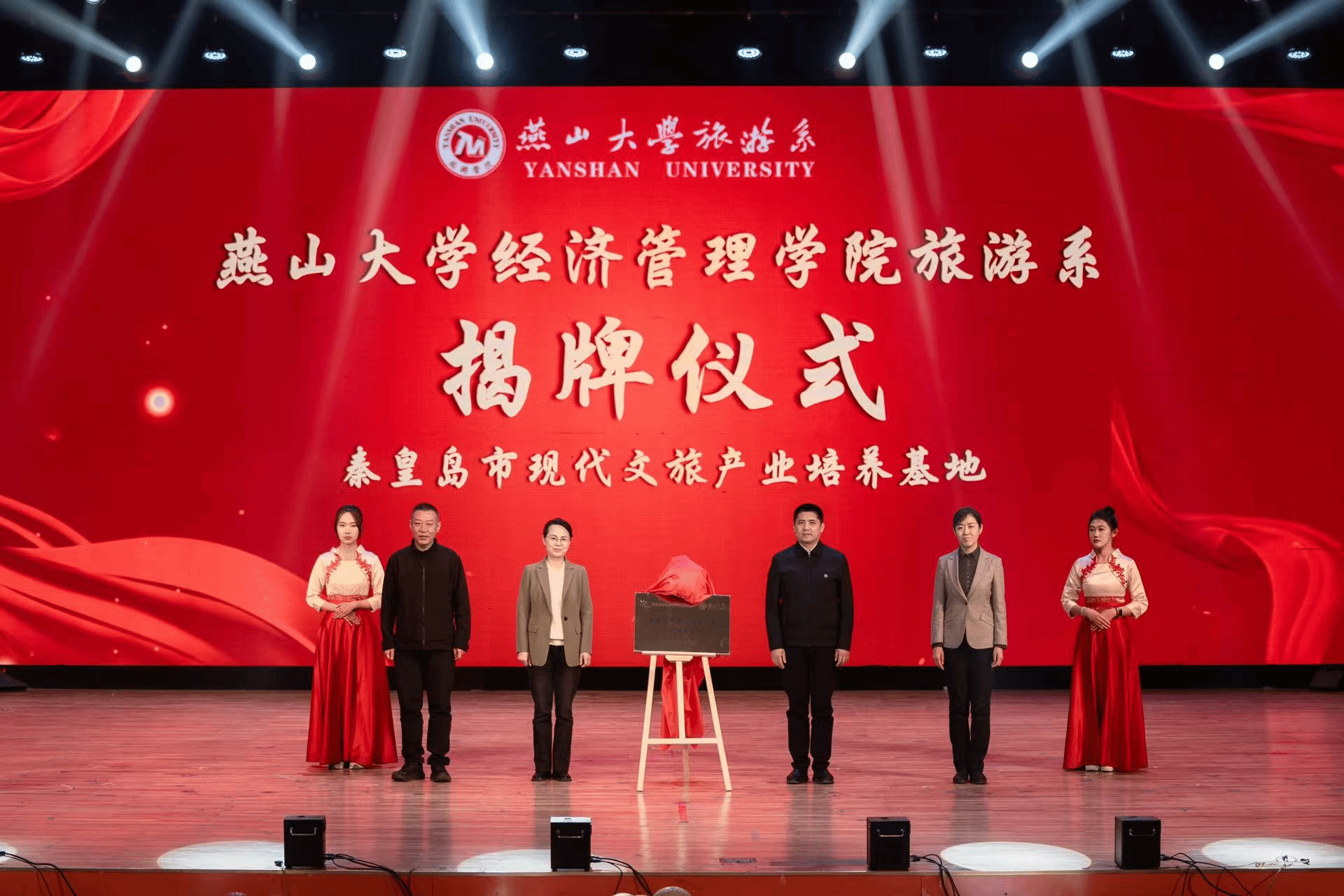 晚会期间,张博威、孙红磊,在王岩、段磊以及全体观看晚会师生的见证下共同揭牌“秦皇岛市现代文旅产业人才培养基地”,标志成人网