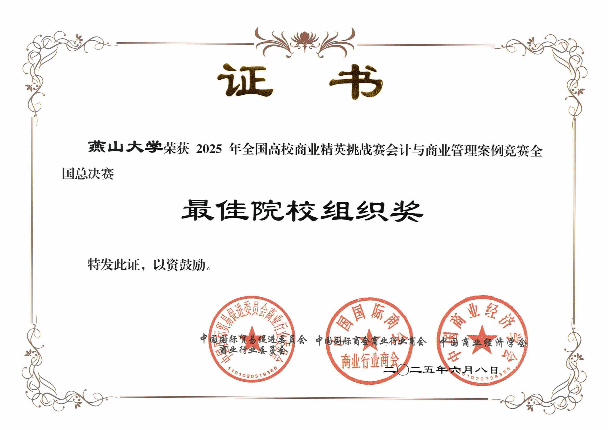 图3 最佳院校组织奖获奖证书