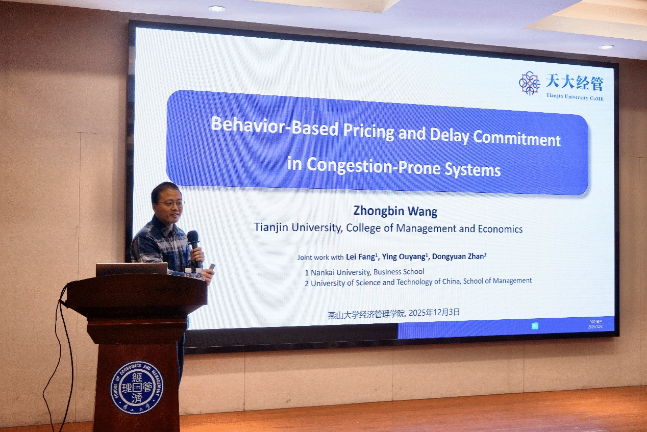 在经管楼A218举办“燕山大讲堂”系列学术报告。天津大学管理与经济学部英才教授、博士生导师王钟彬应邀作题为“外卖服务系统中的杀熟定价与服务承诺”的学术报告。学院相关教师以及研究生共六十余人参加了本次活动。本次报告由成人网