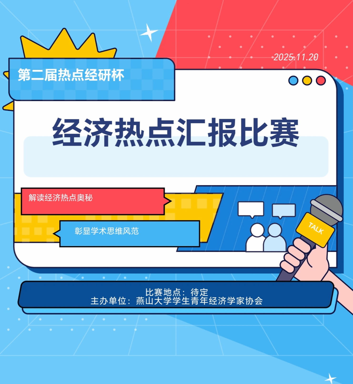 我们诚挚邀请每一位热爱思考、心系经济热点的同学,踊跃加入第二届“热点经研杯”经济热点汇报大赛!在这里,你将与志同道合的伙伴一同聚焦经济前沿,畅谈见解、交流观点,在思维碰撞中激发灵感,在深度研讨中收获成长。请有意参赛的同学务必于规定时间内完成报名并按时提交作品,期待在赛场上见证你的卓越风采与思想光芒!