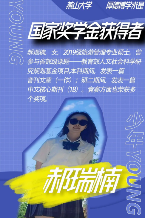 她无论是在生活和学业上都有着不俗的成绩。在科研学习上,曾参与省部级课题——教育部人文社会科学研究规划基金项目“高铁条件下京津冀区域旅游效率分析及协同提升路径研究”,本科期间,发表一篇普刊文章(一作);研二期间,发表一篇中文核心期刊(1B)。竞赛方面也荣获多项奖状:2020-2021年硕士研究生国家奖学金、第三届全国大学生旅游设计大赛二等奖、全国大学生金融精英挑战赛优秀奖、成人网