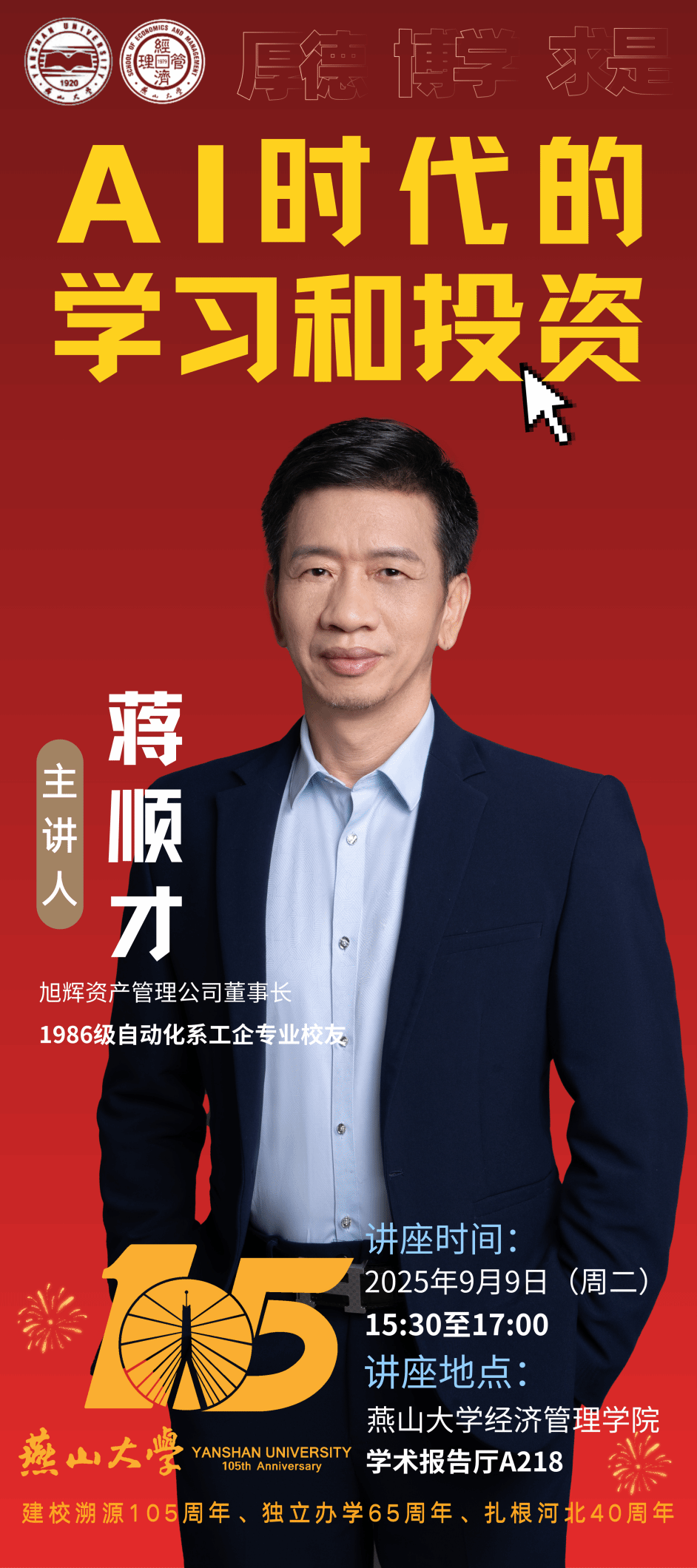 建校溯源105周年、独立办学65周年、扎根河北40周年校庆之际,校友返校周系列活动再掀高潮。9月9日,杰出校友蒋顺才博士重返母校,在经管楼A218报告厅带来"AI时代的学习和投资"主题讲座,与全体燕大人共探AI浪潮下的成长机遇。众多校友慕名前来参会。讲座由经管学院副处级辅导员张薇主持。