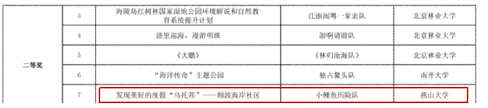 本次参赛作品以海洋旅游为主题、时代创新性突出。经过专家评委三轮评审,由旅游系三位同学组成的“小鲤鱼历险队”的参赛作品《发现美好的度假“乌托邦”——颐波海岸社区》获得华北赛区二等奖。