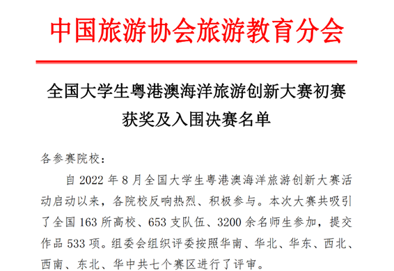 近日,旅游系吴雨鸿、关舒心、刘新宇三位同学在由中国旅游协会旅游教育分会主办的“全国大学生粤港澳海洋旅游创新大赛”中荣获华北赛区二等奖,指导教师高磊获“优秀指导教师”称号。