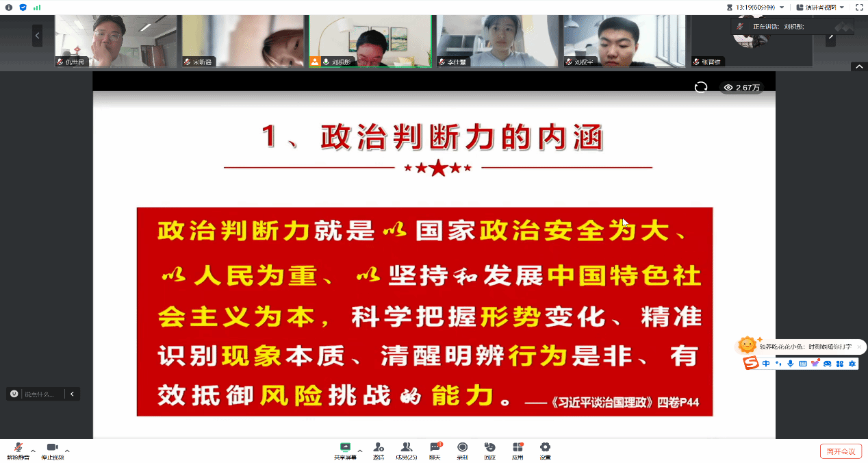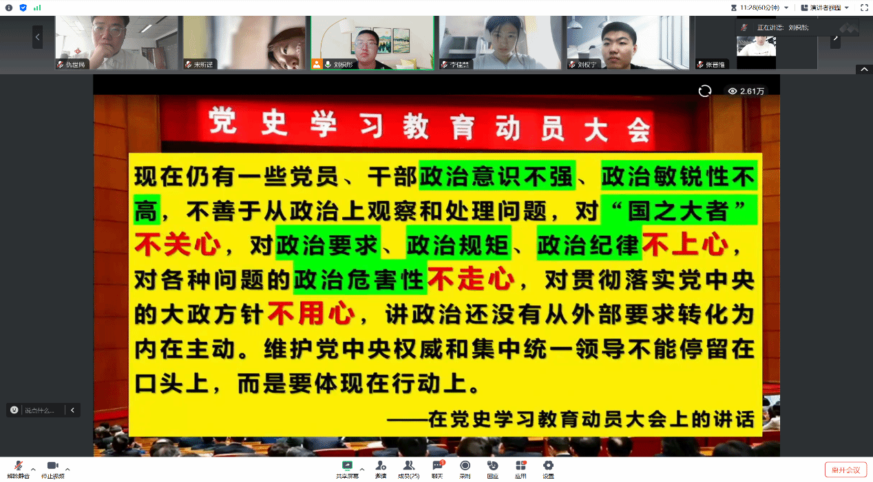 本科生第六党支部组织党员集体参与了“凝心铸魂·聚力发展”党员空中课堂第十期培训班的学习。由于到部分专业党员在外实习,本次学习以线上会议的形式开展。