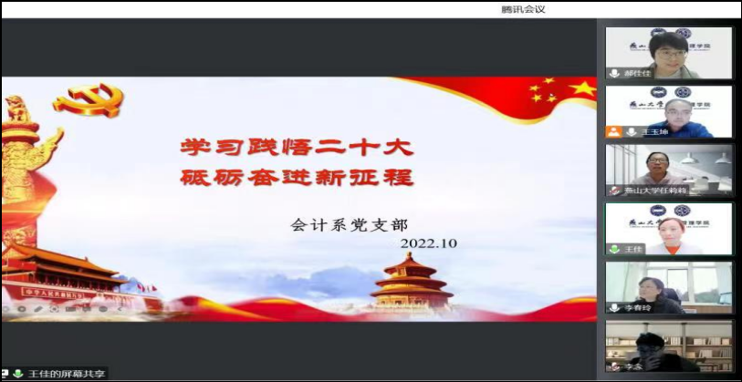 最后,王佳老师带领会计系党支部全体老师集体表态:将按照二十大报告的要求,进一步细化工作目标和举措,落实利德树人根本任务,持续推进会计教育高质量发展。