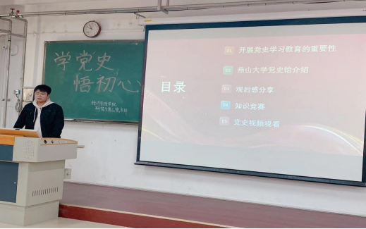 接下来是各班党员代表进行党史学习教育的分享交流。我们要从党史学习教育中汲取经验和智慧,用党的奋斗历程和伟大成就鼓舞斗志、明确方向;用党的光荣传统和优良作风坚定信念、凝聚力量;用党的实践创造和历史经验启迪智慧、砥砺品格。