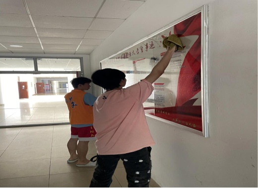 活动过程中,同学们分工明确,各司其职,有条不紊地进行清理。每名积极分子都认真仔细,一丝不苟,不放过任何一个角落。学院A区的展板、门牌及周围环境清理得一尘不染,干净整洁。亮丽的黄马甲打造了志愿服务亮丽的风景。