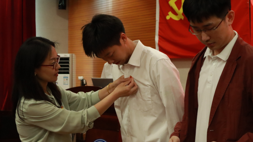 大会第二项:李宁老师、张梦老师为新党员代表佩戴党员徽章。
