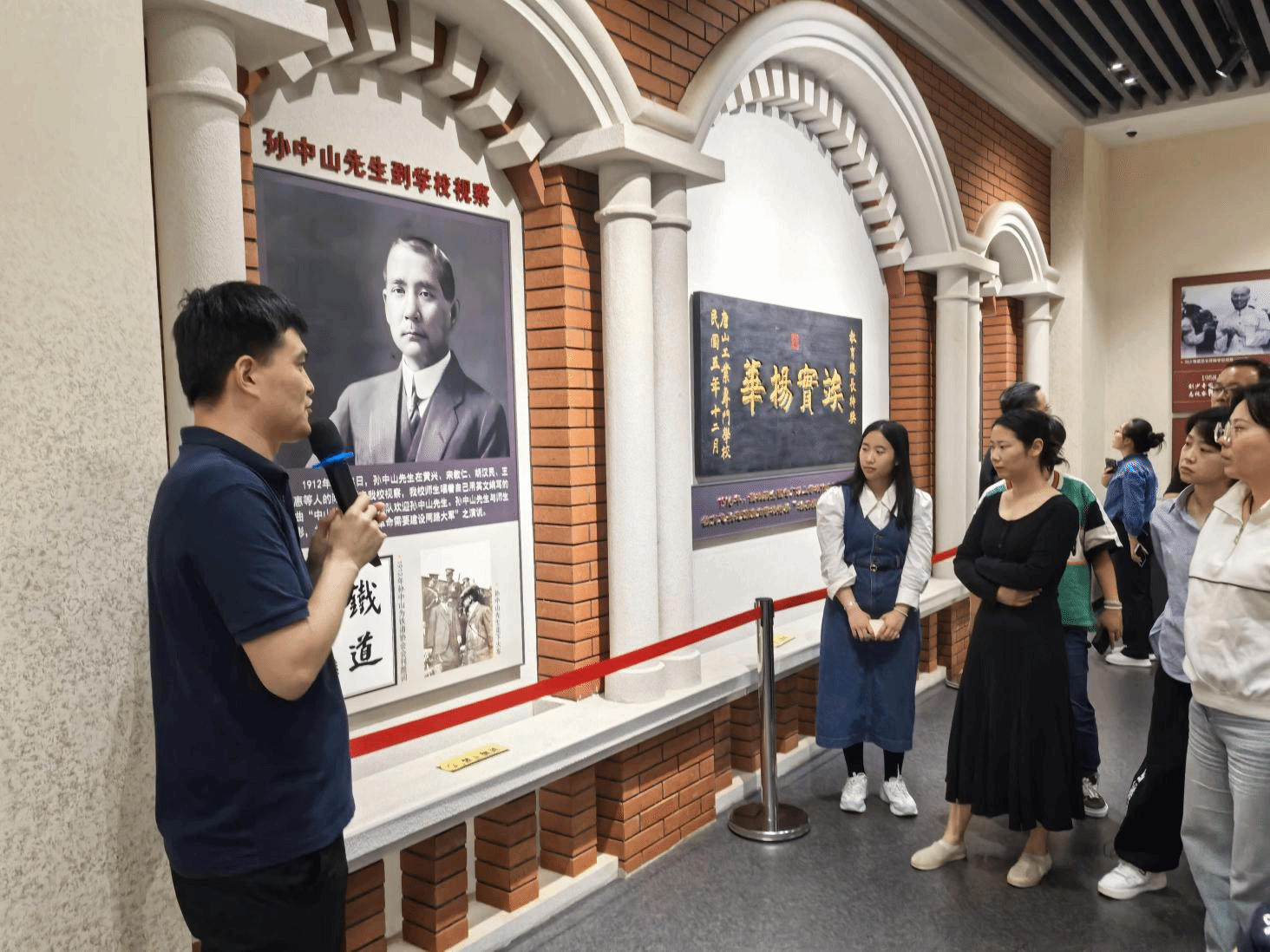 活动伊始,同学们在博物馆复刻的“交通大学”古朴校门前整齐列队、集体合影,红墙白柱的历史建筑与朝气蓬勃的班级身影相映,定格下与“第二校园”历史对话的珍贵瞬间。步入馆内,“教育救国”展区率先吸引大家目光。展柜中,山海关北洋铁路官学堂的校史档案、泛黄的早期铁路专业教材,以及记录战火中辗转办学的黑白老照片,静静诉说着学校创办之初“以教育救亡图存”的初心。展区内关于校史名人茅以升早年求学的史料,同学们或俯身凝视展品,或围在展板前听讲解,不时轻声交流,对交大背后的历史厚度有了更深理解。