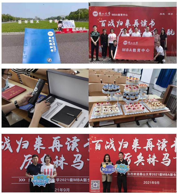 的楼下,印着“百战归来再读书,厉兵秣马重启航”红色大招牌在远远的等待着我们,老师和同学们也在热情的欢迎着我们,帮我们拍照,领我们去教室休息,教室里摆放了很多小蛋糕和矿泉水,让舟车劳顿的我们得到一丝慰藉。教室里由负责帮我们整理材料的同学和老师,那天天气有雨,中心的老师贴心的给我们每一个同学都准备了大礼包——印着我们MBA教育中心字样的伞,保温杯、本子、钢笔,也是让我们非常感动并且爱不释手。